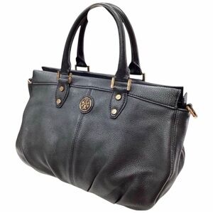 Tory Burch Black Pebbled Leather Satchel Tote – Gold Hardware – Classic Logo