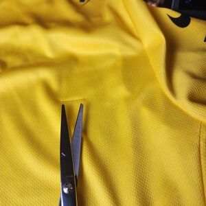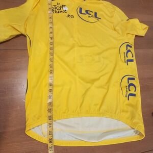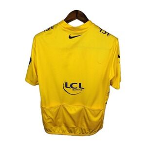 This is a Nike Tour de France jersey for cyclists. It's in the traditional yellow shade with logos from Nike and LCL Banque on the front and back. There is a half-zip closure in the front and three pouches on the back. The only note is a minor pull in the fabric on the back. See the last photo for perspective.
