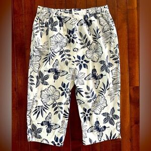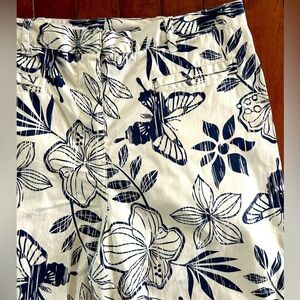 Chic capris with a navy butterfly and floral design. Perfect for casual outings. Front pockets. Front zipper and clasp closure. Excellent condition and never worn. Smoke and pet free home. I ship fast!