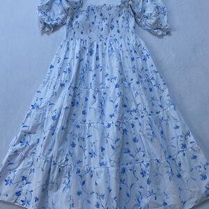 Charming women's dress with blue floral design. Features puff sleeves and smocked bodice. Perfect for casual wear.