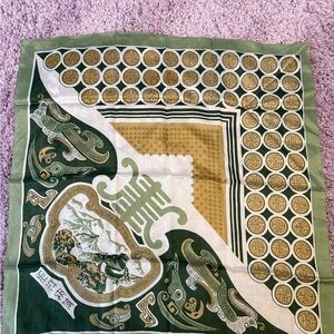 Elegant scarf with intricate green and gold patterns. Perfect for adding a touch of sophistication. Please note the photographed areas of damage. Approximately 28” square. Light and soft. Every effort has been made to photograph this scarf in natural light but actual color may be different than photos. Fabric unknown; most likely polyester.