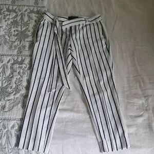 Chic women's pants with classic black stripes on white. tie waist. Perfect for stylish occasions.
