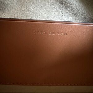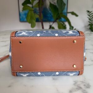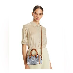 Tory Burch Petite T Monogram Denim Barrel Crossbody Satchel Bag Blue Tan Leather