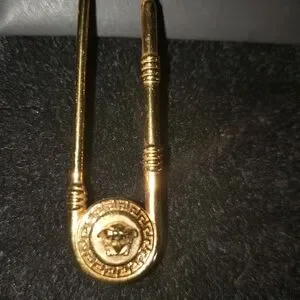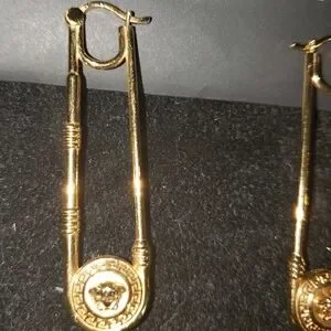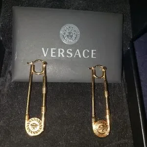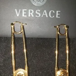 Elegant Authenic Versace Medusa chandelier drop safety pin earrings in a stunning 24kt plated gold finish. Perfect for adding a touch.