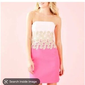 Chic strapless mini dress. Features pink skirt and light pink bodice. Elegant lace detailing.Lilly Pulitzer pink & gold textured 100% cotton dress. This dress is perfect for wedding season, formals, Barbie days, wicked, so many events!