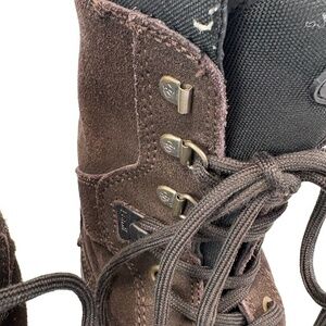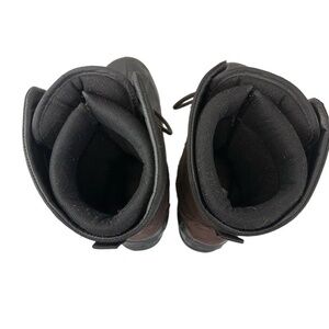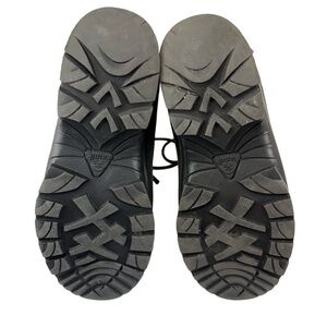 Condition: These shoes are in good preowned condition with signs of wear. Possible signs of use may include scuffing, creasing, wear on the soles, or other general signs of previous wear. Please review all photos carefully for details on condition. Specific flaw(s): 3/4 aglets are missing from shoestrings. A top lace hook missing from each boot.
