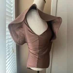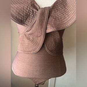 This elegant brown swim one piece features a stylish ruffled design, perfect for any pool side. Its unique style adds a touch of sophistication to your wardrobe. Never worn!