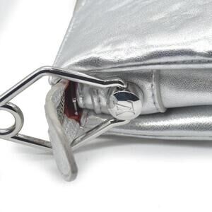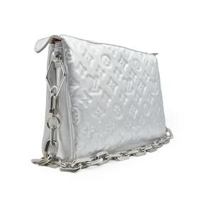 This is an authentic LOUIS VUITTON Metallic Lambskin Embossed Monogram Coussin PM in Silver. From Louis Vuitton's spring 2021 collection, this soft and supple shoulder bag is featured in puffy lambskin in metallic silver and is embossed with Louis Vuitton monogram. The bag can be carried solo as a clutch or with a strap. The three zippered compartments are lined in bright red microfiber.