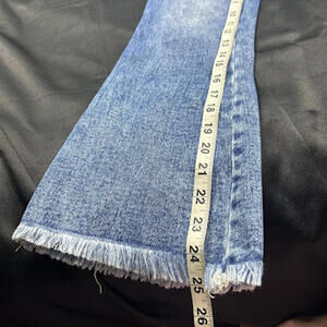 Flying Monkey WOMENS medium wash midrise flared leg jeans with frayed bottom. Size 24