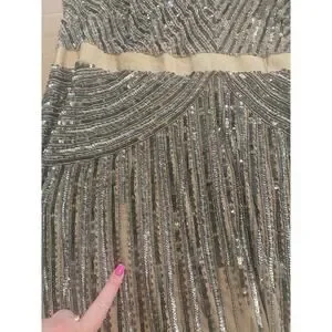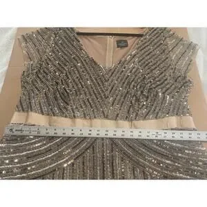 Details: V-neck, hidden back zip, cap sleeves, slim satin waistband, sequined and beaded bodice and hips, lightening through skirt, fitted bodice with relaxed skirt, lined, floor-length