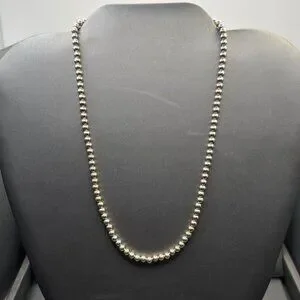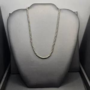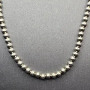 Vintage sterling silver Navajo style pearl choker necklace featuring 4mm hand-finished beads and a classic hook closure. Measures 14" long, ideal for collar or layering wear. Unmarked but tests positive for sterling. A timeless Southwestern style piece with minimalist charm and versatile appeal.