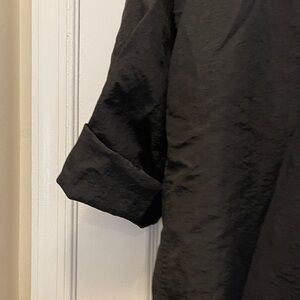 Chic black utility jacket with gold buttons and zippers. Ideal for a modern look. The hood can be zippered up. The sleeves can be rolled up. In excellent condition.