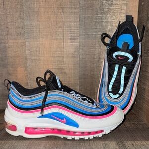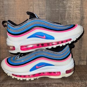 Like new, but used condition pair of Stylish Air Max 97 platinum sneakers made by NIKE— vibrant neon multicolor design. Features pink, blue, and black accents. Size 4Y—