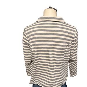 Elevate your casual chic with this Pixley knit blazer, a must-have layering piece that seamlessly blends comfort and style. The classic grey and ivory stripe pattern creates a timeless look, while the soft knit fabric offers a relaxed feel perfect for all-day wear. Three-quarter sleeves add a touch of modern sophistication, and the button-front closure provides versatile styling options. This blazer is ideal for brunches, casual office days, or weekend outings.excellent condition