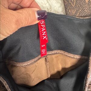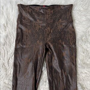 SPANX FAUX LEATHER SNAKESKIN LEGGINGS IN BROWN, size small (runs small), excellent preowned condition, perfect for party and casual occasions. These leggings feature a snakeskin design in brown and black, made of high-quality faux leather material. The pull-on closure provides ease and comfort, while the performance/activity aspect is perfect for walking.