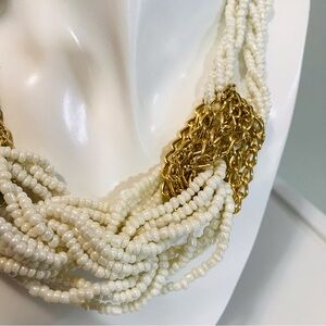 Beautiful vintage 90s gold and white beaded necklace in nice pre-loved condition. Features glossy white beads woven into a chain-link, rope-style design with warm gold-tone accents for a chic, timeless 90s look.