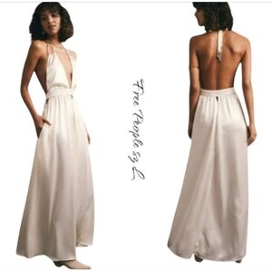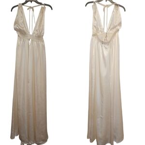 free People Look Into The Sun Front Slit Halter Top Open back Satin Silky Shinny Cutout Maxi Ivory Dress