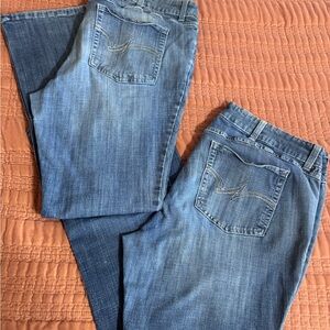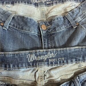 Used condition- Wrangler bootcut jeans in light and dark blue. Durable denim with classic stitching. Both jeans are size 22Wx32. Some staining on back-circled in picture, also one pair is thinning in the thigh area, as noted in pictures. Jeans come from a smoke free/pet friendly household.
