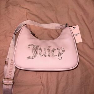 Elegant Juicy Couture shoulder bag with sparkling embellishments. Light pink hue adds a feminine touch. Perfect for daily essentials. About 11” in length. Valentines gift.