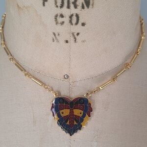 Vintage Enamel/Epoxy Heart Pendant Necklace with Butterfly Center
