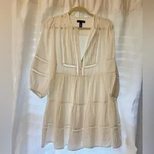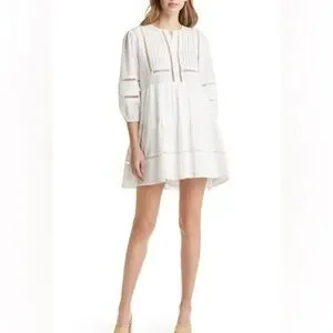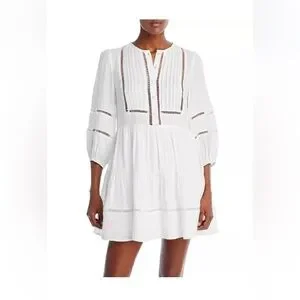 This charming white sundress by Aqua features a ruffled, tiered design perfect for casual or resort wear. The dress boasts 3/4 bishop sleeves and a crew neck, offering a relaxed yet stylish silhouette. Its airy fabric and soft color make it an ideal choice for warm weather outings. AQUA