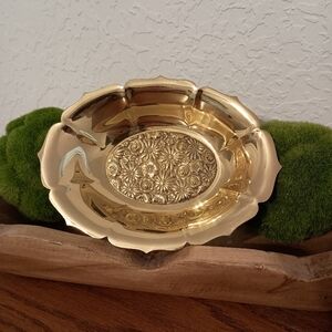 Vintage brass trinket dish with embossed floral bed pattern