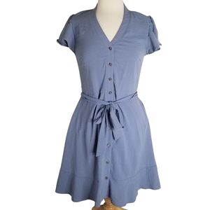 Lucky Brand Blue Crepe Button Front Tie Waist Dress Size L Flutter Sleeves