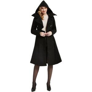 Women Black Wool Winter Goth Lapel Peacoat Outwear Thick Hood Trench Coat