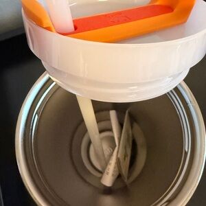 Vibrant goldenrod Stanley tumbler with sturdy handle. Ideal for maintaining drink temperature.