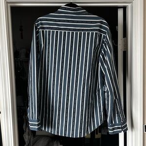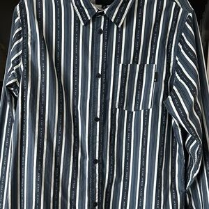 Stylish HUF shirt with navy and white stripes. Features button-down design and chest pocket with effortless relaxed fit. Loose oversized fit on women. I loved wearing this shirt and all the laughs it got when people realized what it said 😇