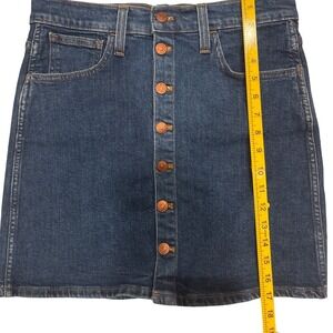Keywords: Madewell skirt, denim skirt, button front, A line skirt, mini skirt, dark wash, size 28, copper buttons, five pocket, cotton blend, casual, everyday, classic