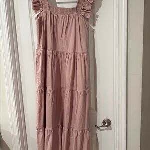 Chic pink maxi dress. Features tiered design. Ruffled shoulder details. Perfect for any occasion.