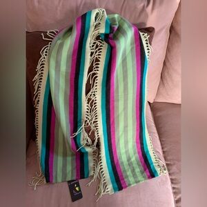 Bright scarf with playful stripes and fringe. Features shades of green, yellow, and cream. Buttery Soft Texture