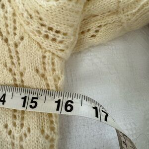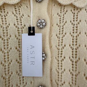 Chic cream cardigan by Astr. Features intricate knit pattern and floral button accents. Perfect for layering.