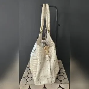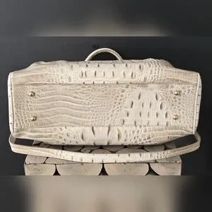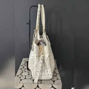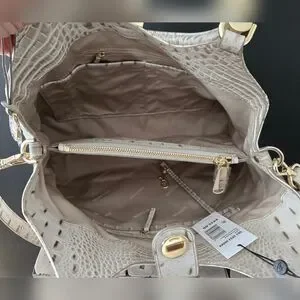 Such a classy leather purse, Brahmin Celia in Stone Bayard, new with tags, measures 13" wide x 11" tall x 5" deep with a 9" handle drop and an adjustable long strap, non smoking home