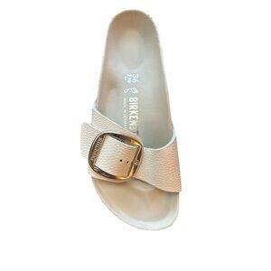 Elegant white sandals with a stylish silver buckle. Comfortable cork footbed. Ideal for casual wear.