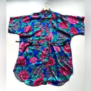 Kathryn Vibrant Vintage 80’Baroque Floral Jewel Tone Satin Lingerie Kimono Robe
