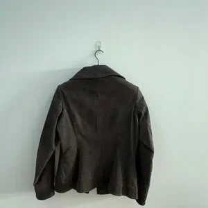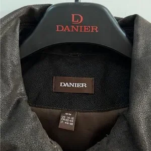 Elegant chocolate leather jacket by Danier. Features a shirt collar and button front. Perfect for any occasion.