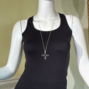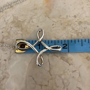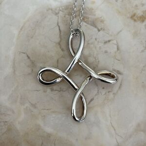 Very rare authentic Tiffany & Co. Elsa Peretti infinity cross in extra large size. This stunning piece hangs from a branded Tiffany Elsa Peretti sterling silver chain that is 28” long.