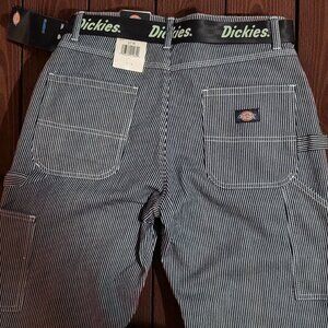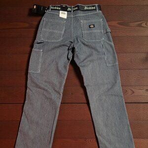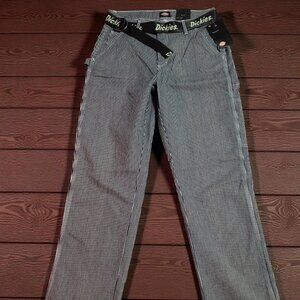 Keywords: Dickies pants, carpenter pants, workwear, relaxed fit, contrast stitching, womens fashion, utility pants, casual wear, streetwear, belted pants, black pants, size 28, new with tags