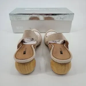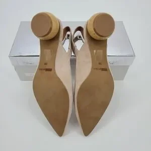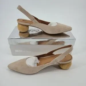 Matiko point toe sling back heel. Leather upper and lining, with suede textured outer body. Heel is a delightfully unique man made sealed wooden ball. Very clean, dressy boho vibe. Heel is lightly padded, size 38/7.5 US. Feel free to leave questions in the comments, thank you!
