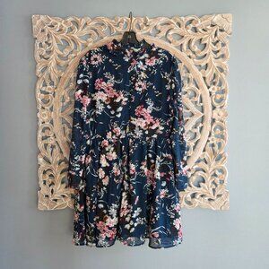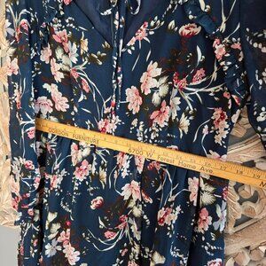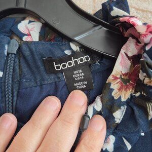 Boohoo Floral Dress Size 18 Blue Long Sleeve Tie Neck Ruffle A Line Cottage NWT
