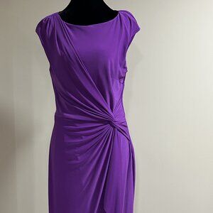 Purple sleeveless dress with draping along the front making it look like a wrap dress. Jersey material so stretchy. Pullover with rounded neckline and fully lined.