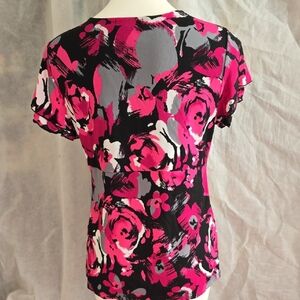 Chic floral blouse with a twist front. Bold pink, black, and gray design. Perfect for versatile styling.