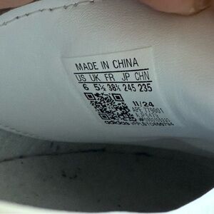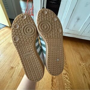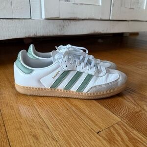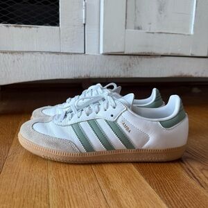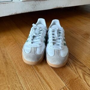 Classic Adidas Samba trainers in white with green stripes. Boys size 6. Fits women’s 7.5