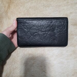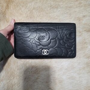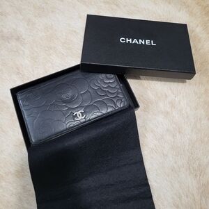 chanel black camellia lambskin leather wallet with box