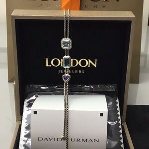 Features striking blue gemstones on a silver chain. Adds elegance to any look.New never worn. Sterling Silver,Hampton Blue Topaz,Blue Topaz and iolite Pave Diamonds. Slider clasp for the length to be adjusted Comes with original box,DY pouch and certificate. Very difficult to find.