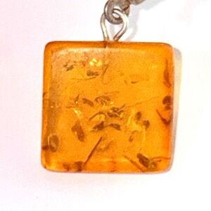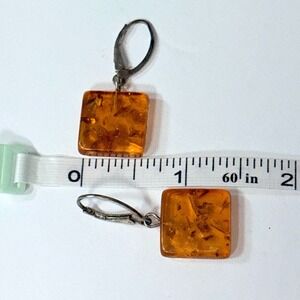 Authentic amber square dangle earrings. These captivating earrings feature genuine amber stones set in a polished square shape, suspended from elegant silver toned leverback closures. The rich, warm tones of the amber, with natural inclusions visible within, create a unique and eye-catching natural design. Overall really good vintage condition.