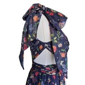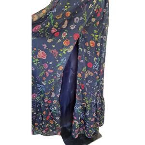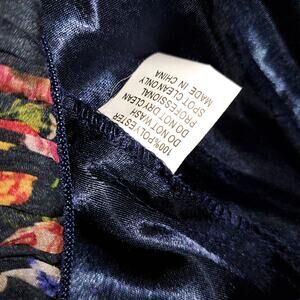 Navy multicolor floral & butterfly print sheer chiffon overlay; satin lining