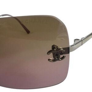 Elegant CHANEL rimless sunglasses. Features rose-tinted lenses and sleek silver arms. Ideal for a sophisticated style.
